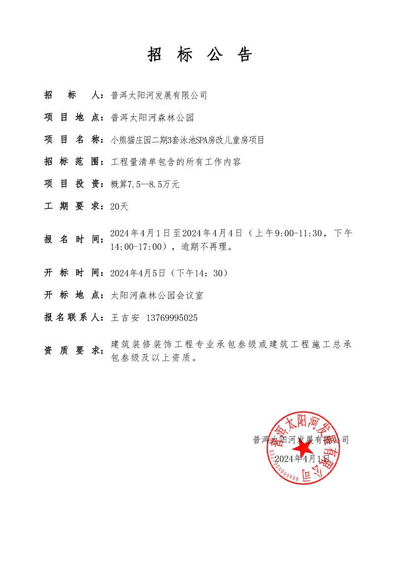小熊猫庄园二期3套泳池SPA房改儿童房项目——招标公告