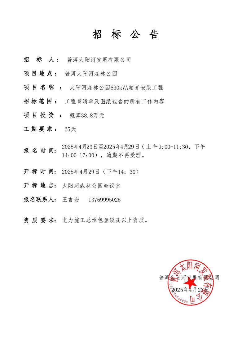 太阳河森林公园630kVA箱变安装工程——招标公告